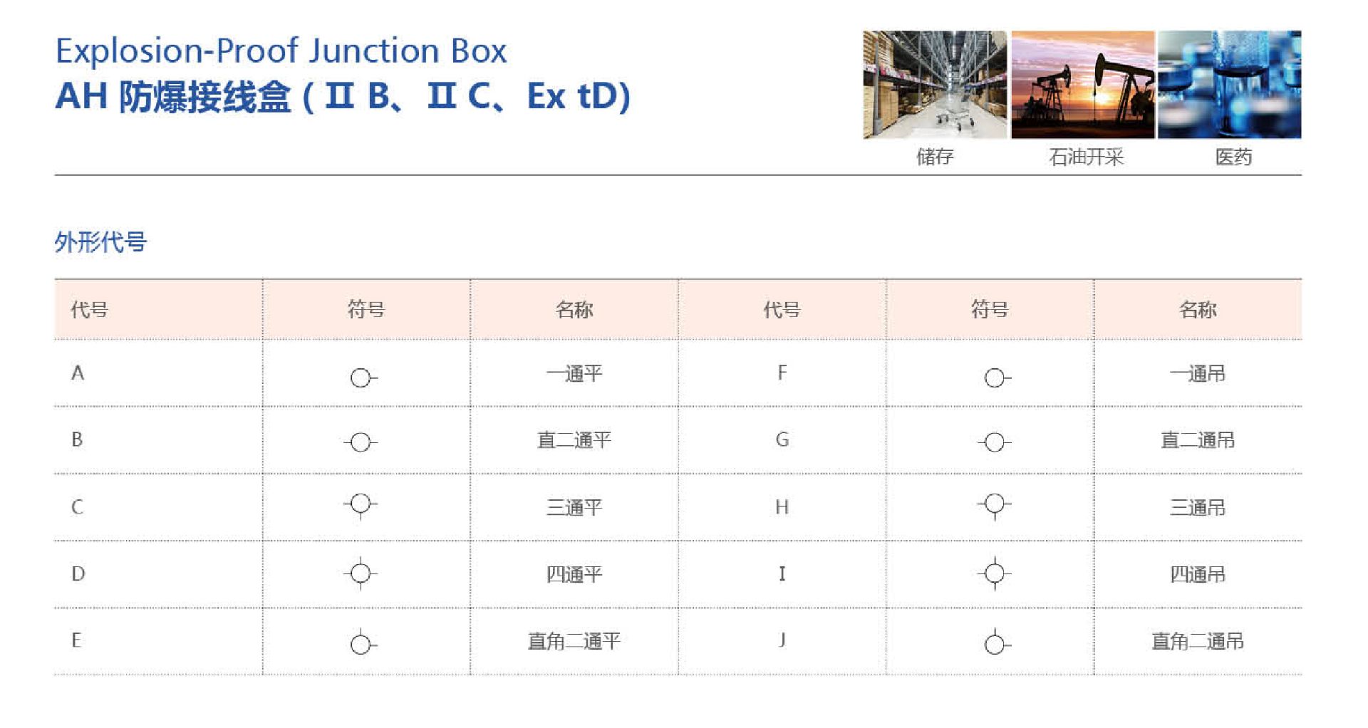 IP65AH系列防爆接线盒代号 代号 外形 名称 代号 外形 名称 A 一通平 F 一通吊 B 直二通平 G 直二通吊 C 三通平 H 三通吊 D 四通平 I 四通吊 E 直角二通平 J 直角二通吊
